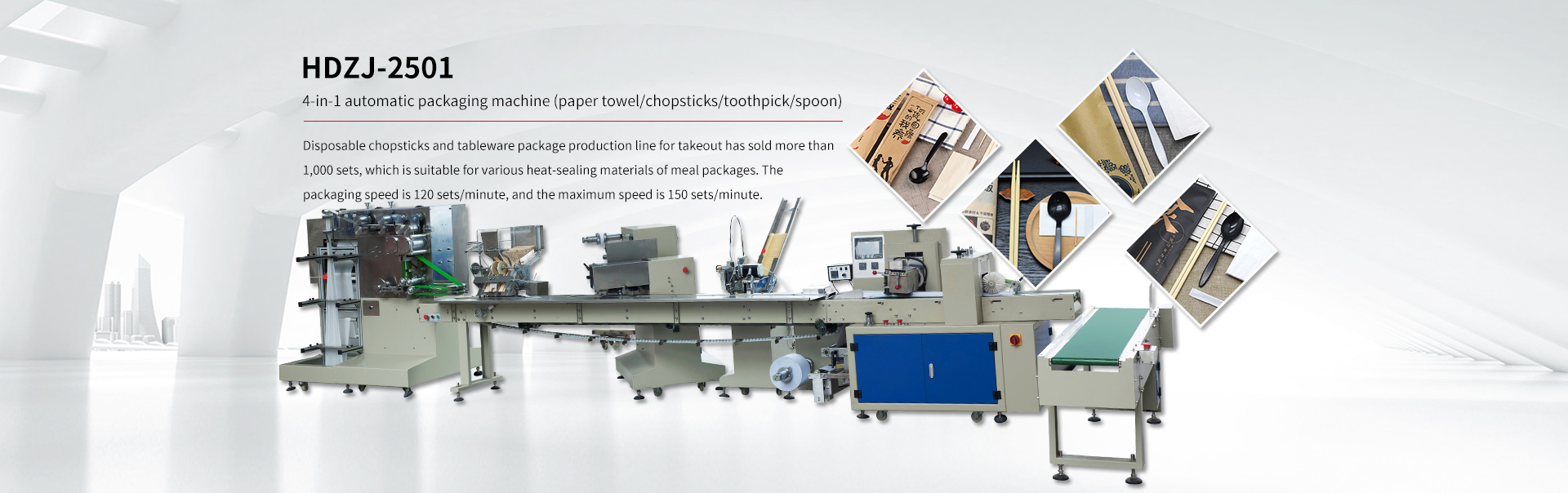 Guidie focuses on the development of disposable paper towel chopsticks tableware package production line, paper towel knife and fork aviation tableware packaging line, disposable tableware set four-edge sealing production line, plastic cup (bowl), straw automatic counting automatic packaging machine and hardware (plastic) products packaging machine.